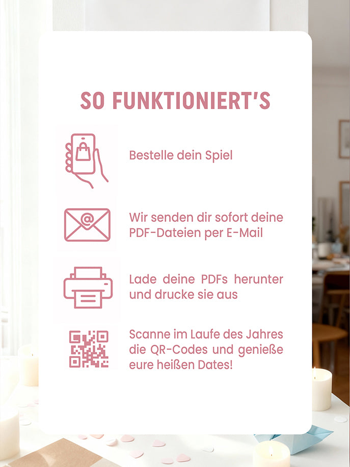 Bestelle, lade die PDFs herunter, drucke sie aus und folge den Anweisungen. Fertig – sofortiger Date-Night-Spaß!
